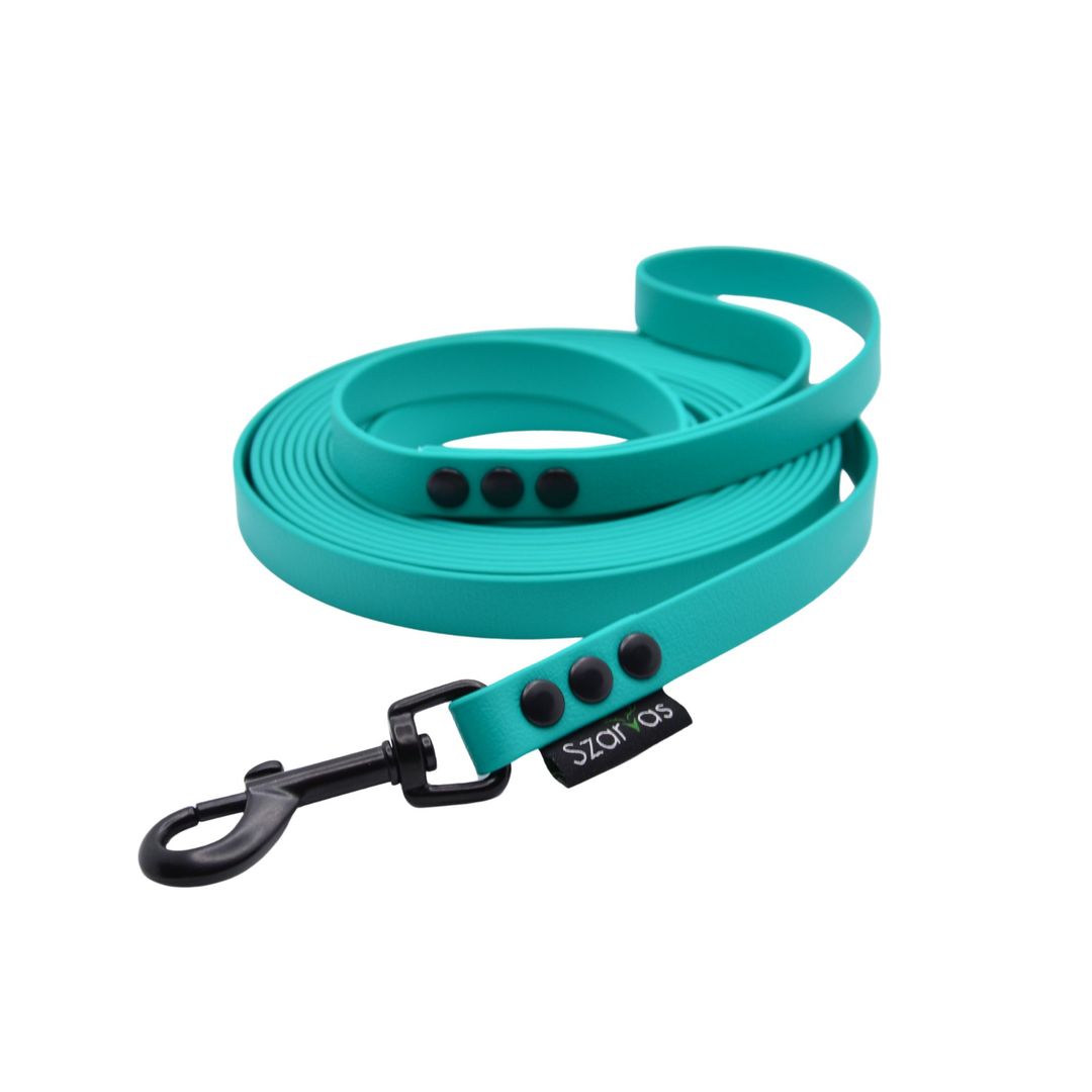Wytrzymała i lekka smycz treningowa dla psa z materiału PCV, w kolorze turkusowym o długości 5 metrów.